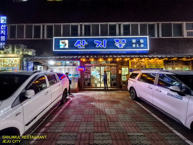 Restoran makan malam kami yang bernama Sanjimul Restaurant terletak berhampiran sebuah taman awam di pinggir bandar Jeju City.